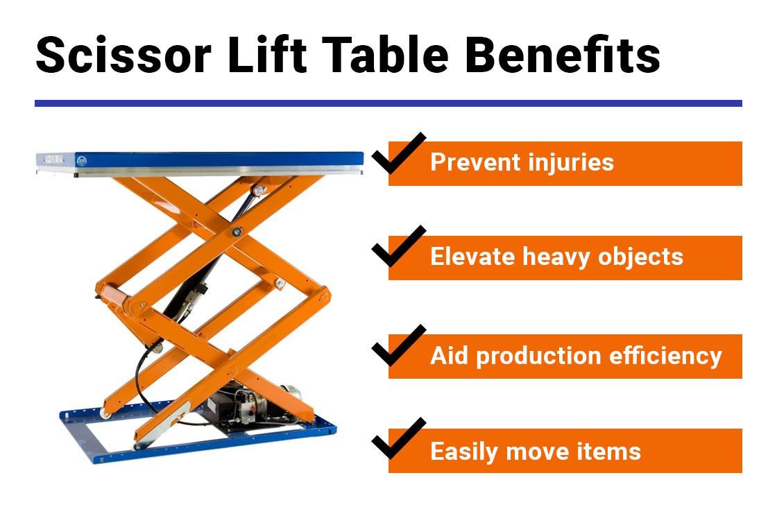 Brilliant within many situations, and easy to use due to their thoughtful designs, scissor lift tables use powerful hydraulic or pneumatic cylinders, enabling them to securely and safely raise or lower components weighing hundreds or sometimes even thousands of pounds. This not only takes the strain away from employees, who could otherwise injure themselves, but also streamlines the process of moving materials up or down from the floor, often resulting in injuries to the back or spine area, taking time to safely plan out.